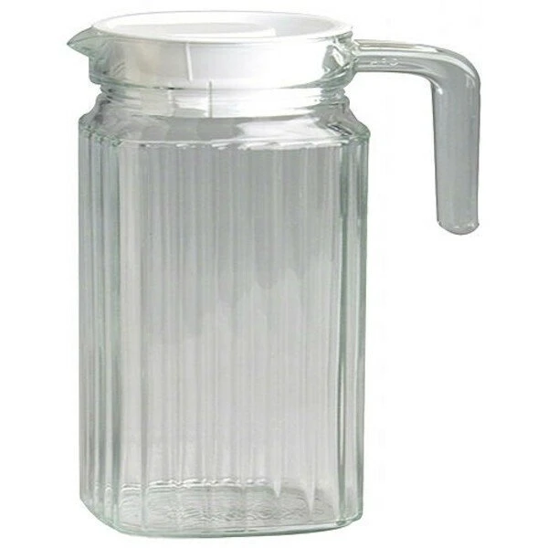 Sogar die Jüngsten können mit dem Krug Quadro ihre Getränke ohne Hilfe einschenken. Der breite Griff liegt sicher in der Hand und selbst im gefüllten Zustand ist er nicht zu schwer. Er ist ganz aus Glas und hat ein längs gestreiftes Rillenmuster, womit er zu jedem vorhandenen Geschirr passt. Seine quadratische Form wird durch eine Rundung am Hals unterbrochen. Ein Deckel aus weißem Kunststoff verhindert, dass Insekten ins Getränk gelangen. Der Krug Quadro lässt sich in der Spülmaschine reinigen.